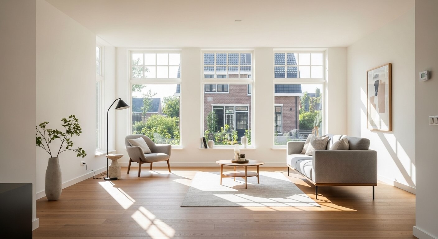 Als de woning op het zuiden ligt, fotografeer dan in de ochtend. Ligt de woning op het noorden, dan werkt de late middag beter. Dit klinkt als een detail, maar het verschil in beeldkwaliteit is opvallend.